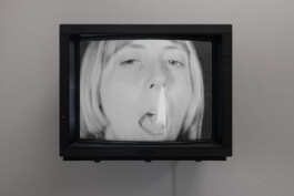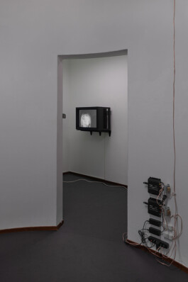 Installation view of Spirits talks n.1 and n.2, 2023, hand-processed 16mm film transferred to Full HD, CRT monitor, 1’39’’ and 1’48’’ on a loop, at Sonnenstube, Lugano, CH